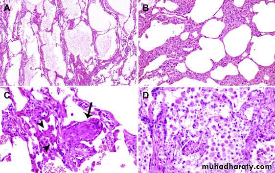 They exhibit congestion, interstitial and intra-alveolar edema, inflammation, and fibrin deposition. The alveolar walls become lined with waxy hyaline membranes . Alveolar hyaline membranes consist of fibrin-rich edema fluid mixed with the cytoplasmic and lipid remnants of necrotic epithelial cells, resolution is unusual; more commonly, there is organization of the fibrin exudate, with resultant intra-alveolar fibrosis.