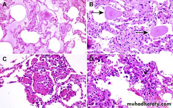 (A) Diffuse alveolar damage in the acute phase. Some alveoli are collapsed,while others are distended; many are lined by bright pink hyaline membranes