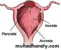 Placenta accreta refers to an abnormal placental implantation in which the anchoring placental villi attach to the myometrium, rather than being contained by decidual cells but not too deep in the uterine wall. This results in a placenta that is abnormally adherent to the uterus(75%).