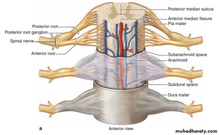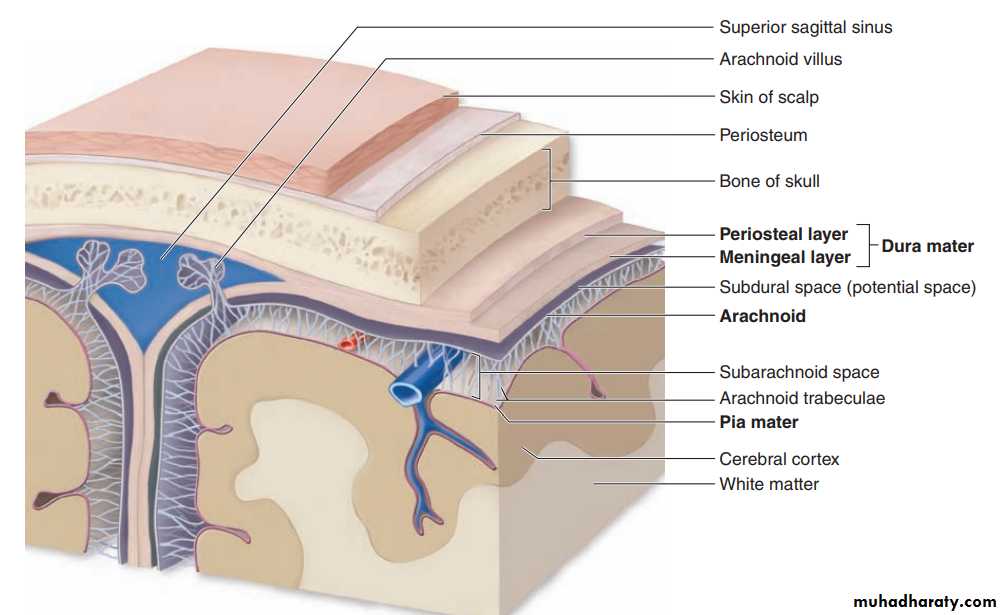 I- Dura Mater: The thick external dura mater (L., dura mater, tough mother) consists of dense, fibro-elastic connective tissue that is continuous with the periosteum of the skull. The dura mater is always separated from the arachnoid by the thin subdural space. The internal surface of all dura mater, as well as its external surface in the spinal cord, is covered by simple squamous epithelium of mesenchymal origin.