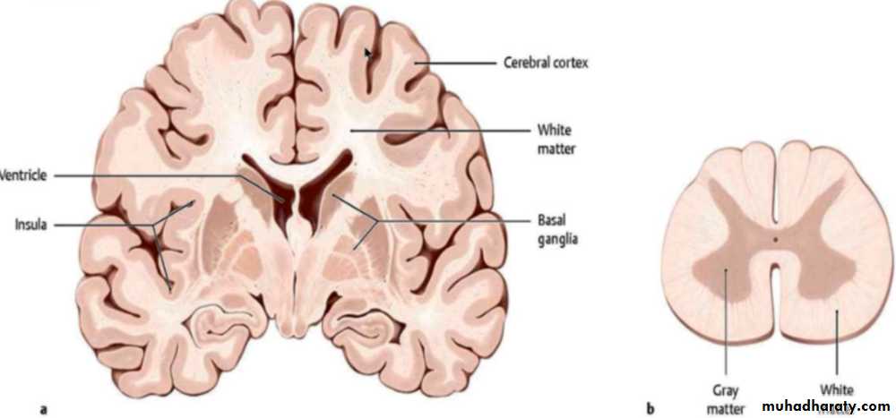 CENTRAL NERVOUS SYSTEM The major regions of the central nervous system (CNS) are the cerebrum, cerebellum, and spinal cord, the CNS is covered by three connective tissue layers, the meninges, but contains very little collagen or fibrous tissue throughout its substance, making it relatively soft and easily damaged by injuries affecting its protective cranium or vertebral bones, The entire CNS displays organized areas of white matter and gray matter, differences caused by the differential distribution of myelin, the main components of white matter are myelinated axons , often grouped together as tracts, and the myelin-producing oligodendrocytes, White matter contains very few neuronal cell bodies, but astrocytes and microglia are present, gray matter contains abundant neuronal cell bodies, dendrites, the initial unmyelinated portions of axons, astrocytes, and microglial cells. Gray matter occupies the thick surface or cortex of both the cerebrum and the cerebellum; most white matter is found in deeper regions. Deep regions of the CNS also have darker aggregates called nuclei consisting of large numbers of neuronal cell bodies and surrounded by white matter.