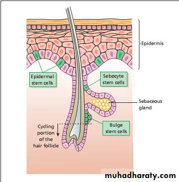 Stem cells reside amongst interfollicular basal cells and amongst the cells of the external root sheath at the bulge in the hair follicle at the level of attachment of the arrector pili muscle.