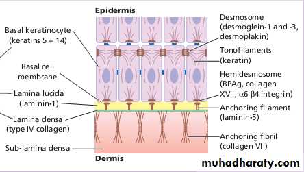 lamina lucida contains the adhesive macromolecules, laminin. Fine anchoring filaments cross the lamina lucida and connect the lamina densa to the plasma membrane of the basal cells.
