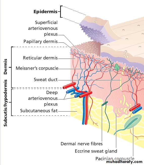 Afferent lymphatics begin as blind-ended capillaries in the dermal papilla, pass to superficial lymphatic plexus in papillary dermis then two deeper horizontal plexuses, run with the veinsNerves