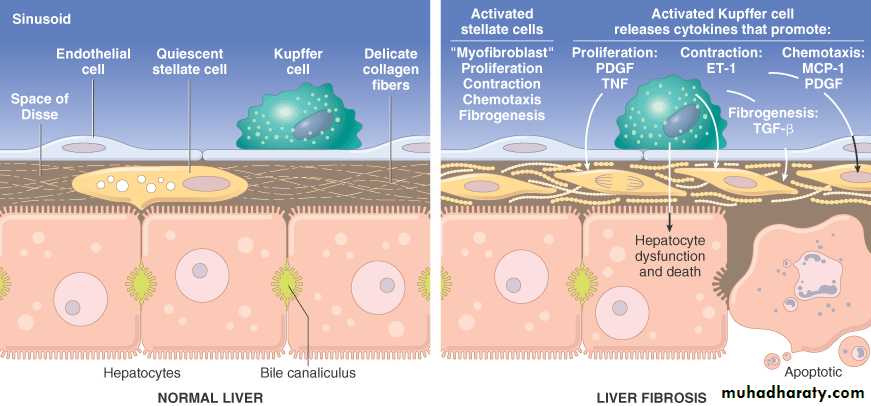 As they are converted into myofibroblasts, the cells release chemotactic and vasoactive factors, cytokines, and growth factors. Myofibroblasts are contractile cells, capable of constricting sinusoidal vascular channels and increasing vascular resistance within the liver parenchyma.
