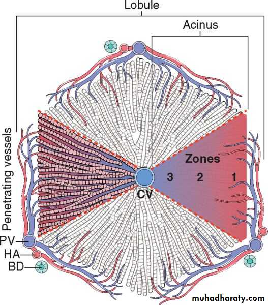 Microscopic anatomy of the liver; the two models, hepatic lobular model and acinar model, are illustrated. In the lobular model the terminal hepatic vein (CV) is at the center of a “lobule,” while the portal tracts (PV) are at the periphery. Pathologists refer to the regions of the parenchyma as “periportal and centrilobular.” In the acinar model, on the basis of blood flow, three zones can be defined, zone 1 being the closest to the blood supply and zone 3 being the farthest. BD, bile duct; HA, hepatic artery