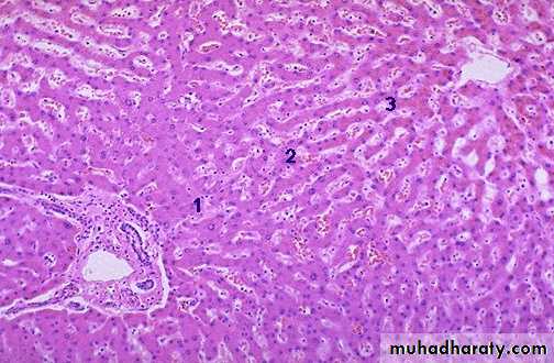 Liver is divided histologically into lobules. The center of the lobule is the central vein. At the periphery of the lobule are portal triads.