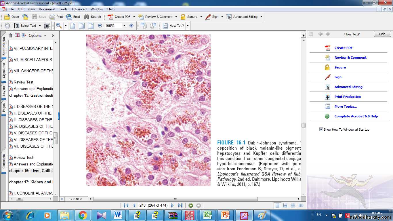 Multiple genetic mutations can cause hereditary hyperbilirubinemia.• Dubin-Johnson syndrome, showing abundant pigment inclusions in otherwise normal hepatocytes