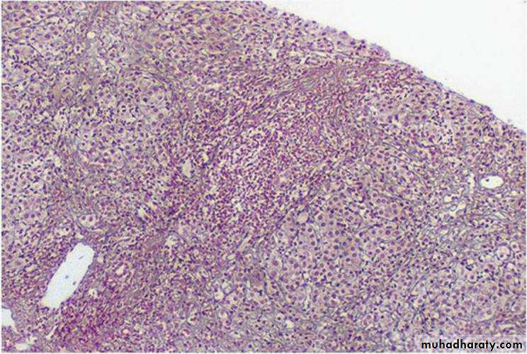 At first, only portal tracts show increased fibrosis, but with time periportal septal fibrosis occurs, followed by linking of fibrous septa (bridging fibrosis), especially between portal tracts.Continued loss of hepatocytes and fibrosis results in cirrhosis.