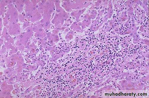 The portal tracts are usually infiltrated with a mixture of inflammatory cells specially mononuclear cells.The inflammatory infiltrate may spill over into the adjacent parenchyma, causing apoptosis of periportal hepatocytes. This is known as interface hepatitis (piecemeal necrosis), which can occur in acute and chronic hepatitis.