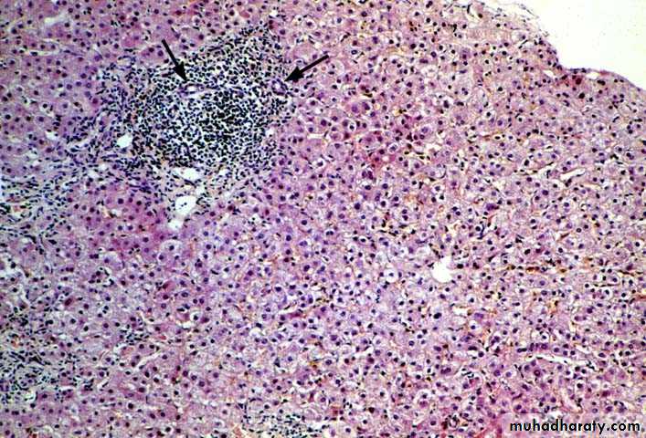 chronic hepatitis, portal tract inflammation appears, but the lobular changes persist. There continues to be lobular disarray, However, despite the presence of portal inflammation, there is no significant bile duct infiltration or damage(arrow).