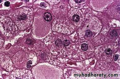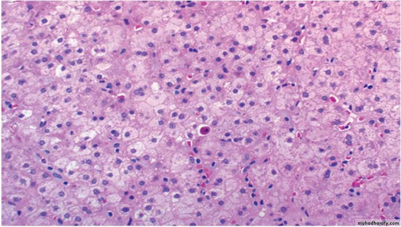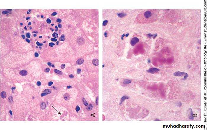 1-Hepatocyte swelling and necrosis: Single or scattered foci of cells undergo swelling (ballooning) and necrosis. The swelling results from the accumulation of fat ,water and proteins that normally are exported.