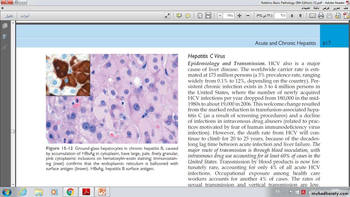 HBV-infected hepatocytes may show a cytoplasm packed with spheres and tubules of HBsAg, producing cell with large, pale, finely granular, pink cytoplasmic inclusions on hematoxylin-eosin staining (“ground-glass hepatocytes”).