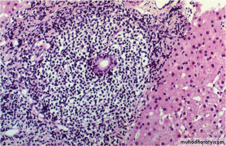In the mildest forms, inflammation is limited to portal tracts and consists of lymphocytes, macrophages, occasional plasma cells, and rare neutrophils or eosinophils.
