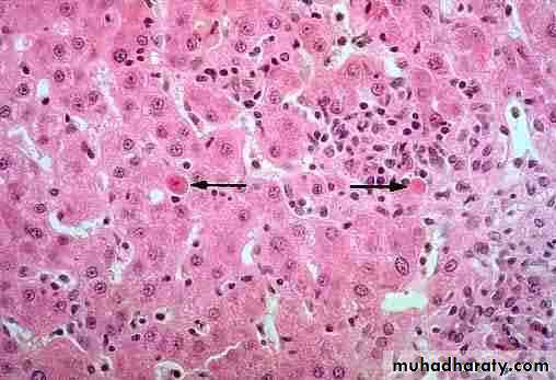 -Apoptosis, Apoptotic hepatocytes shrink, become intensely eosinophilic, and have fragmented nuclei(councilman bodies)