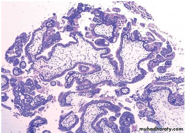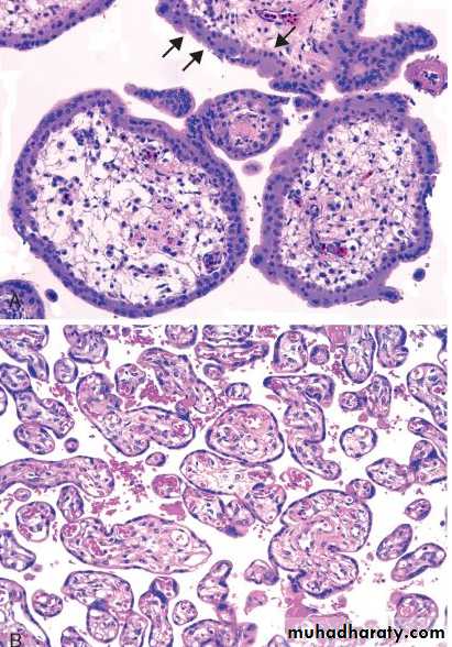 • The chorionic epithelium almost always shows some degree of proliferation of both cytotrophoblast and syncytiotrophoblast . The proliferation may be mild, but in many cases there is striking circumferential hyperplasia.