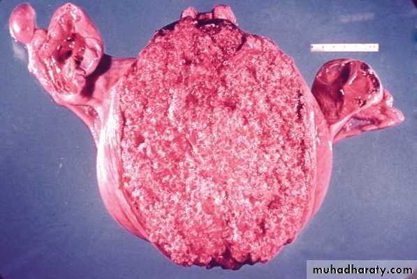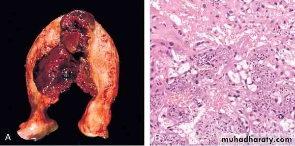 • The tumor appears as very hemorrhagic, soft, nodular, necrotic masses within the uterus.• Some times the primary lesion may self-destruct, and only the metastases tell the story.