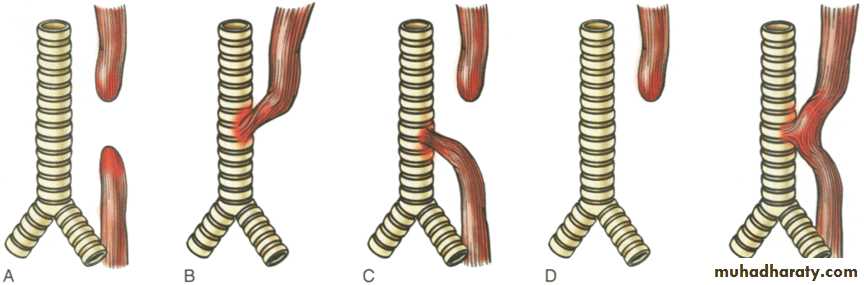 A, Blind upper and lower esophageal segments. B, Fistula between blind upper segment and trachea. C, Blind upper segment,fistula between blind lower segment and trachea. D, Blind upper segment only. E, Fistula between patent esophagus and trachea. Type C is the most common variety.Diaphragmatic Hernia, Omphalocele, and Gastroschisis