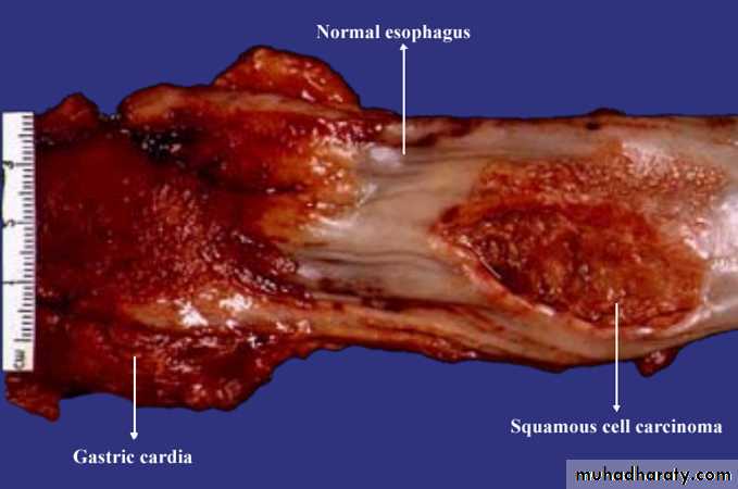 20% of tumors are located in the upper third of the esophagus, 50% in the middle third, 30% in the lower third.Tumors appear as exophytic polypoid lesions in 60% of cases; flat in 10% and excavated-necrotic