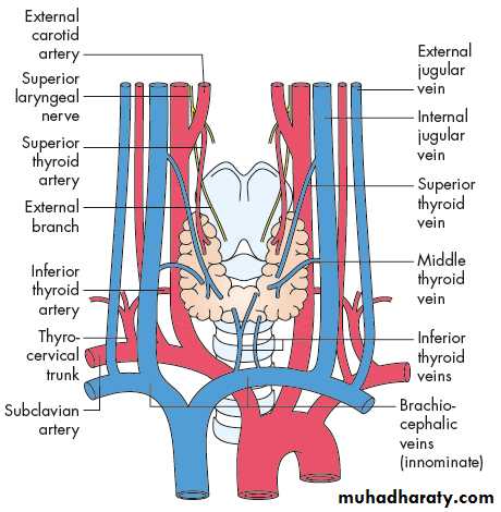 The normal thyroid gland weighs 20–25 g.The arterial supply is rich, and extensive anastomoses occur between the main thyroid arteries and branches of the tracheal and esophageal arteries