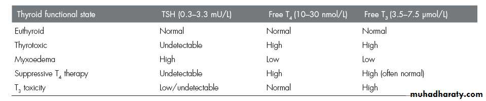 The metabolic effects of the thyroid hormones are due to unbound free T4 and T3 (0.03 and 0.3 per cent of the total circulating hormones, respectively). T3 is the more important physiological hormone and is also produced in the periphery by conversion from T4. T3 is quick acting (within a few hours),