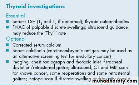clinical criteria to assist in selection for operation according to the risk of neoplasia and malignancy…. hard, irregular swelling …..RLN paralysis……Deep cervical ymphadenopathy The incidence of thyroid carcinoma in women is about three times that in men, but a discrete swelling in a male is much more likely to be malignant than in a female