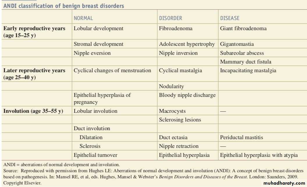 The basic principles underlying the aberrations of normal development and involution (ANDI) classification of benign breast conditions are the following:• benign breast disorders and diseases are related to the normal processes of reproductive life and to involution;