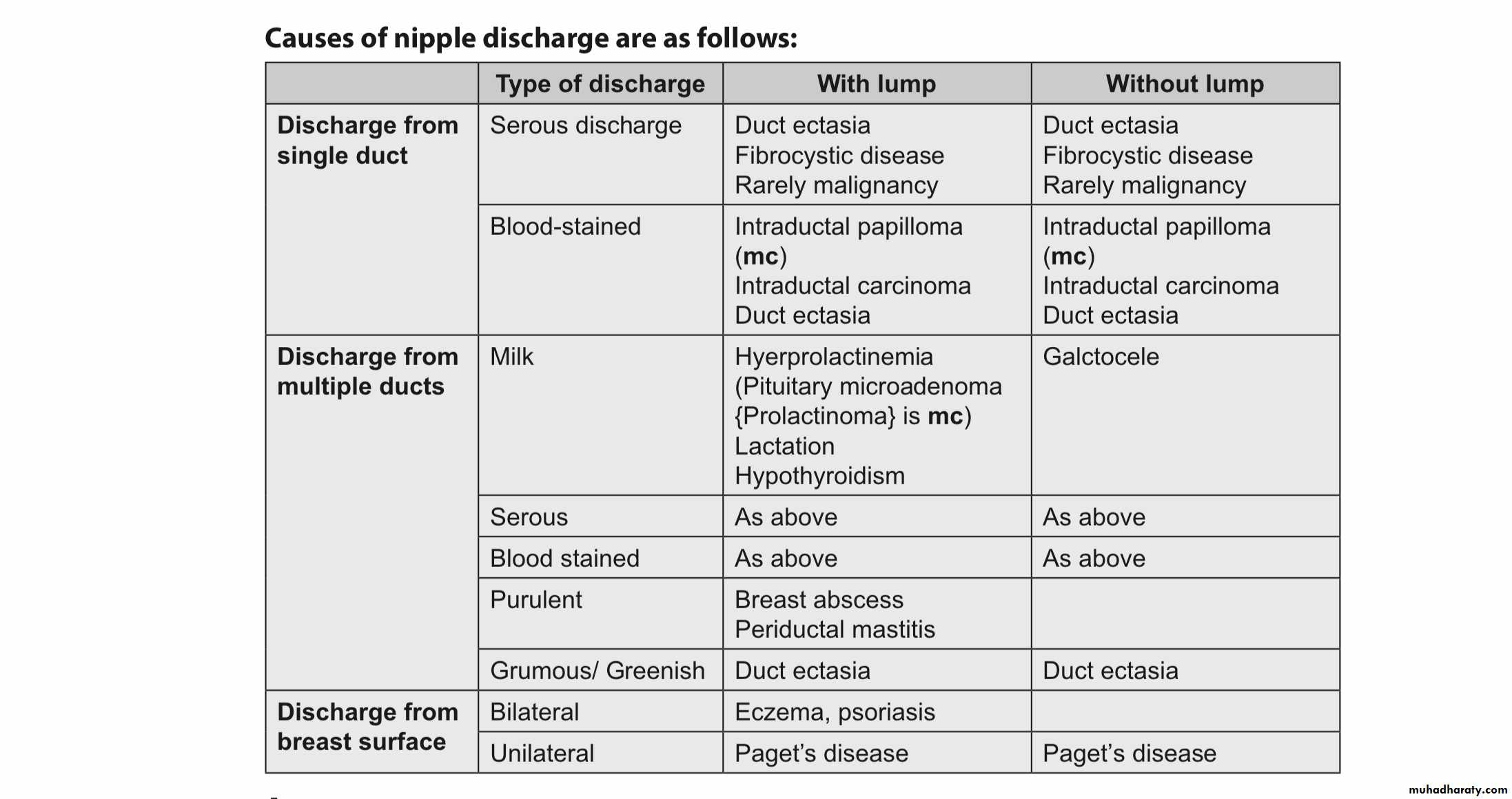 “Single duct, spontaneous, unilateral, blood-stained, clear or serous in a women above 40 years especially with a mass is suggestive of malignancy and needs evaluation.”