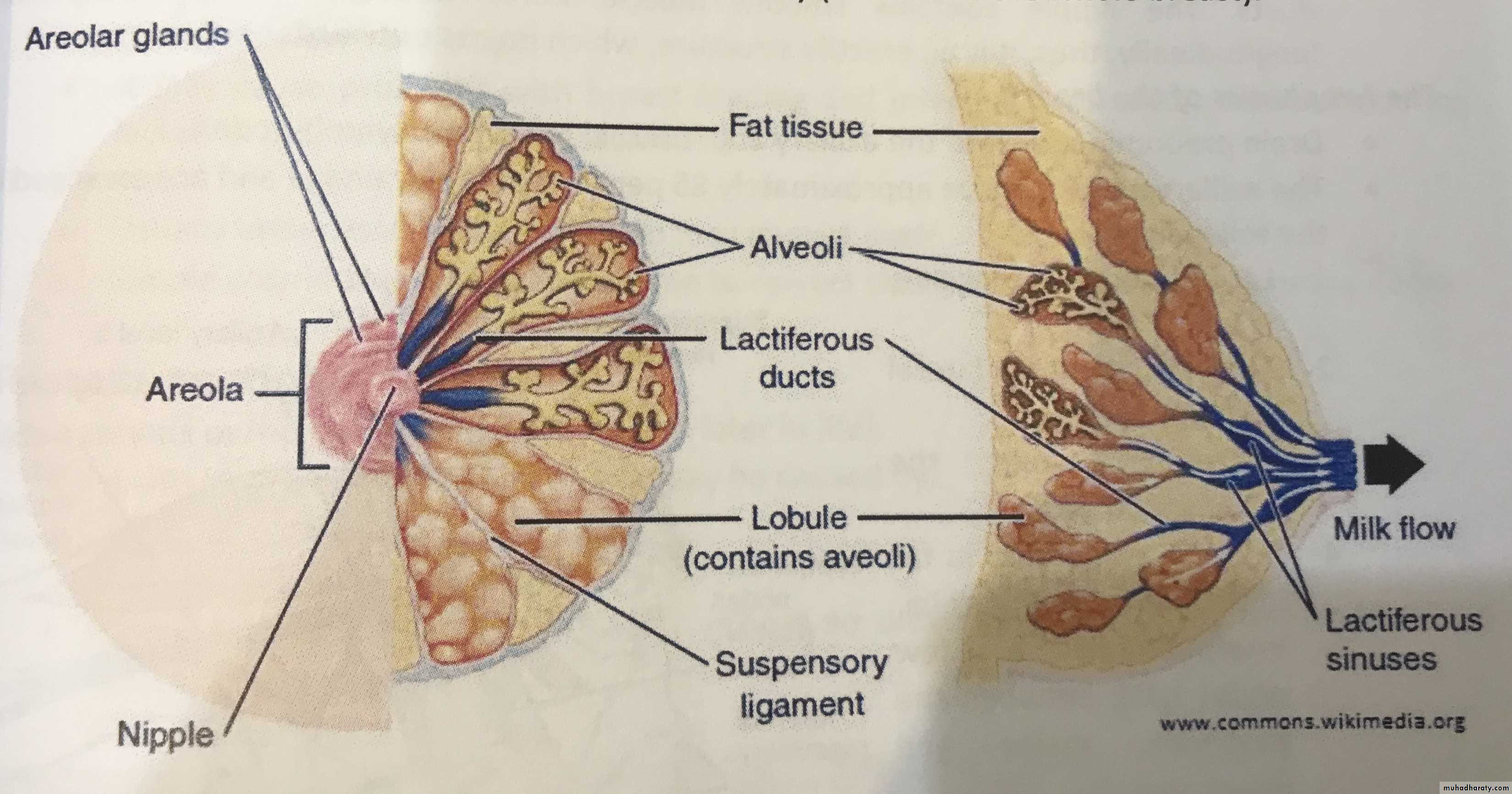 • Near its apex lie the orifiices of the lactiferous ducts .The nipple contain smooth muscle fibers arranged concentrically and longitudinally , thus , its an erectile structure , which points outwards.