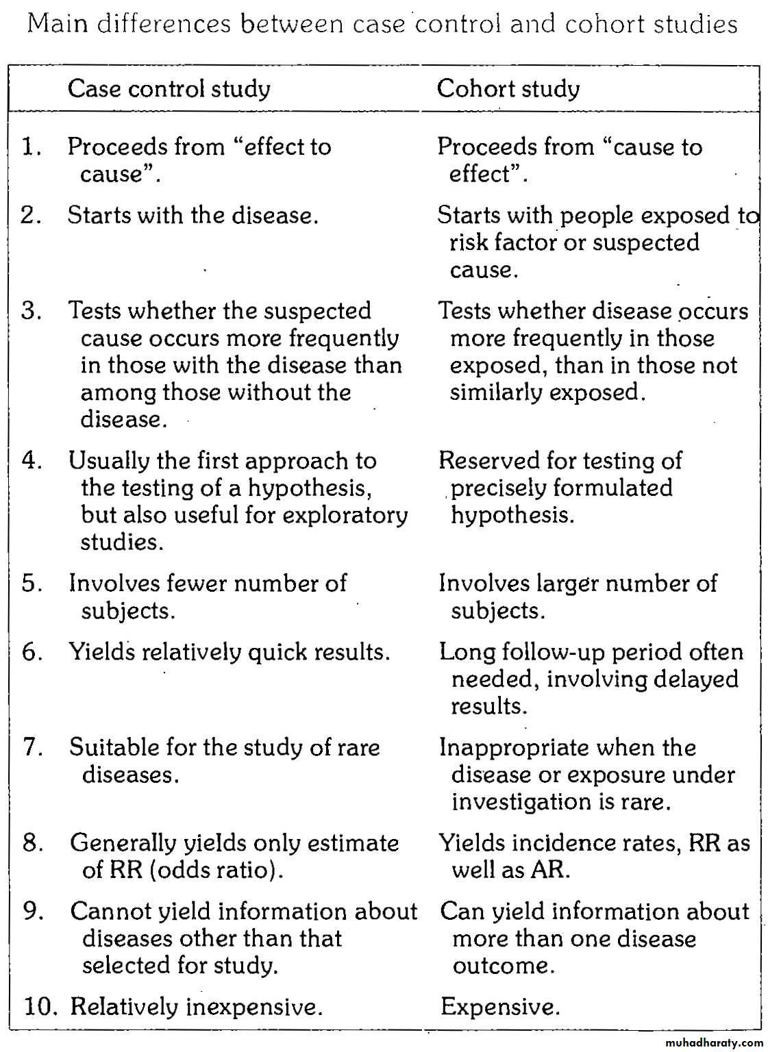 In contrast to case control studies which proceed from ((effect to cause)),the basic approach in cohort studies is to work from ((cause to effect)), that is in case control study,exposure and disease have already occurred when the study is initiated.In cohort study,the exposure has occurred,but the disease has not.