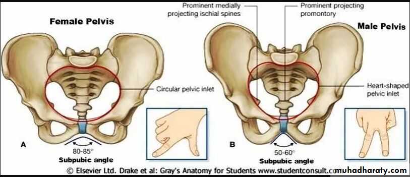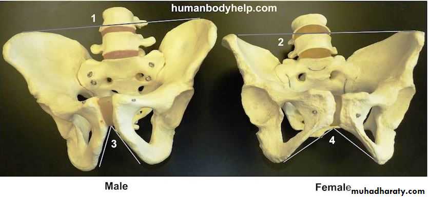 21• يكون عظم الحرقف مفلطحا منبسطا وعرفه مندفعا للخارج في حوض الانثى, بينما يكون مقعرا وحرفه مندفعا الى الاعلى و معقوفا نسبيا الى الداخل في حوض الذكر. الحوض الصادق دائري وواسع عند الانثى بينما يكون عند الذكر ضيقا ومثلث الشكل. الزاوية تحت العانية واسعة (منفرجة )عند الانثى بينما تكون حادة (ضيقة) عند الذكر ونفس الامر ينطبق على الثلمة النساوية. اماعظم العجز فيكون قصيرا وعريضا ومنبسطا في نصفه العلوي عند الانثى بينما يكون طويلا ضيقا ومنحنيا للداخل عند الرجل.