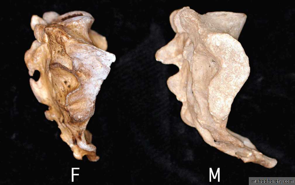 17• الجمجمة: تتميز جمجمة الذكر البالغ عن جمجمة الانثى بثقلها وخشونة ملمسها وكبر حجمها. وبكون النتوء الخشاوي والحرف القذالي بارزين وخشنين وكذلك الامر بالنسبة للجسر فوق الحجاج. تكون الزاوية الجبهية الانفية متميزة في جمجمة الذكر بينما تكون ضحلة في جمجمة الانثى. الوجيه اللقمي لقاعدة الجمجمة عريضا وقصيرا في جمجمة الانثى بينما يكون ضيقا اسطوانيا في جمجمة الذكر.. يتميز الفك السفلي عند الذكر بضخامته جسمه وارتفاع ارتفاقه الذقني وعرض ساقه الصاعد وحدة الزاويو بين الجسم والساق هع ضخامة اللقمة الفكية. بينما في الانثى يكون الفك السفلي صغيرا ناعم الملمس قليل الارتفاع عند ارتفاقه والقسم الصاعد ضئيلا واللقمة الفكية صغيرة.