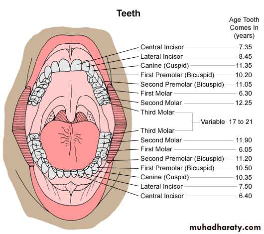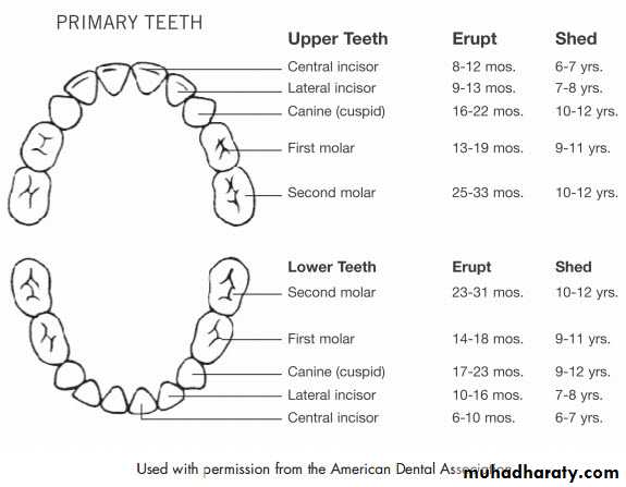 34ويستمر الحال ثابتا حتى نهاية السنة السادسة من العمر وعندها تبدأ الاسنان اللبنية بالسقوط والدئمية بالبزوغ كما يلي: