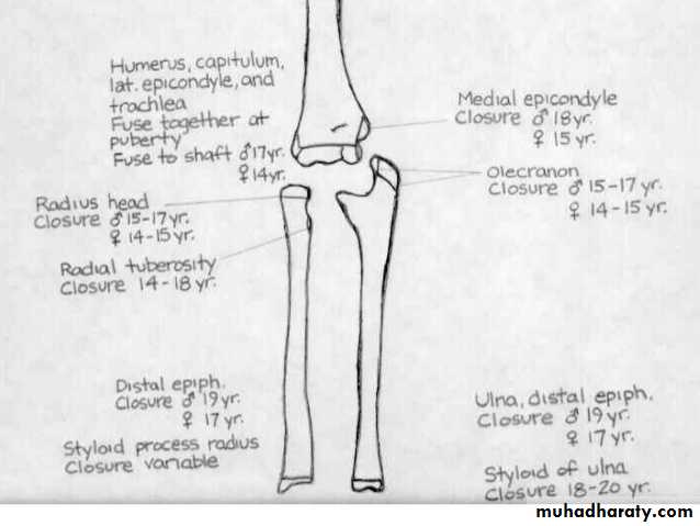 2) في سن 14-15 يلتحم راس الكعبرة بالعمد والنتوء المرفقي بالزند.