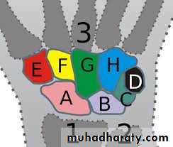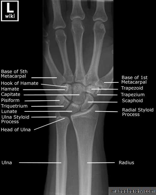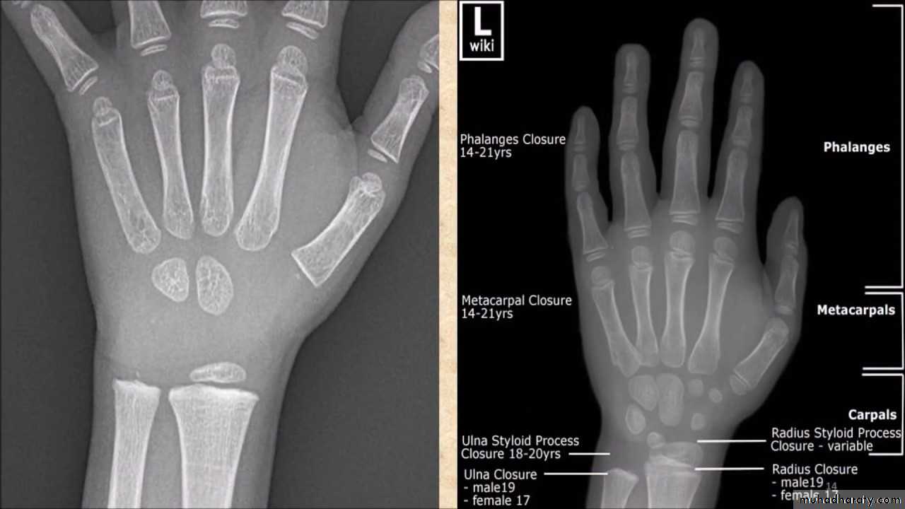 • 4) وفي بداية السنة الخامسة يظهر متع للعظم المربع المنحرف وفي نهاية السنة االخامسة يظهر المركز التعظمي لعظمي شبه المنحرف والزورقي الرسغيين.