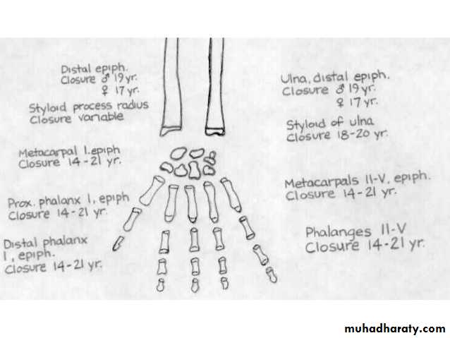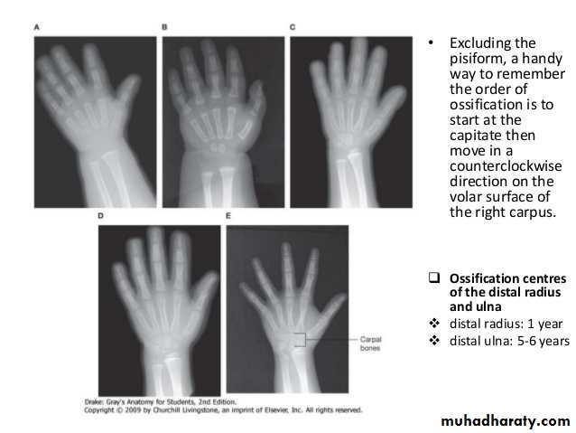 7) في نهاية السنة التاسعة يظهر متع للنتوء المرفقي لعظم الزند والعظم الحمصي.
