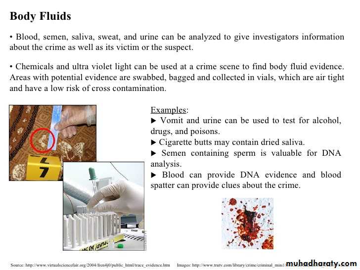 23. بصمات الاصابع: تعتمد دوائر التحقيق الجنائي وبشكل واسع على فحص بصمات الاصابع ومضاهاتها في قيافة الاحياء. والبصمات لاتتشابه , أي عدم وجود بصمتين متشابهتين عند شخصين. وقد خمن احتمال تطابقهما مرة واحدة في كل 64.000.000.000 من البصمات وهو الامر الذي لم يحصل حتى الان. والبصمات في الاساس هي طبع او ختم الجسور الظهارية بين فتحات الغدد العرقية الموجودة على الوجه الراحي للاصابع والكفين. وما يفحص منها في العادة هو الموجود في الوجه الراحي للانمله الظفرية من اصابع الكفين. وهنالك انماط متعدد لبصمات الاصابع واكثرها شيوعا الاقواس, والعروات المتجهة نحو اليمين واليسار, والدوامات(الدوائر متحدة المركز) او قد تتكون ة من اكثر من هيئة واحدة من الاشكال الاريعة مارة الذكر. وقد بدأت دوئر تحقيق الادلة الجنائية اعتماد بصمات الشفاه على اعقاب السكائر والاقداح والملاعق والمناديل.