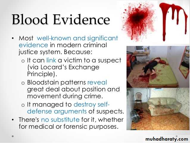 قيافة البقع الدموية: عند قيافة أي بقعة يشتبه بكونها دما يجب ان نحقق التالي: التاكد من كون البقعة دما؟, وهل ان الدم بشري ام حيواني؟ وتعيين جنس صاحب البفعة والزمن المنقضي على البقعة: أي عمرها.