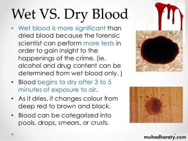 70• 1. يتم التاكد من كون البقعة دما باجراء اختبار البنزدين باستخدام كشاف البنزدين مع حامض الخل الثلجي, فتصبح البقعة ذات لون ازرق اذا كانت دما او قيحا او غائطا. والاختبار يعتمد على اكسدة قاعدة البنزدين بواسطة البيروكسيديز الموجودة بالدم. ان اختبار البنزدين يصنف ضمن الاختبارات التمهيدية للتحري عن البقع الدموية ونتائجه تظهر بسرعة اضافة الى سهولة اجرائه في محل الحادث. فاذا كانت نتائج اختبار البنزدين سلبية فهذا ينفي كون البقعة دما. اما اذا كان الاختبار موجبا فهذا لايعني بالضرورة ان تكون البقعة دموية. واختبار البنزدين من اكثر الاختبارات حساسية ونتائجه تظهر بسرعة اضافة الى سهولة اجرائه في محل الحادث.