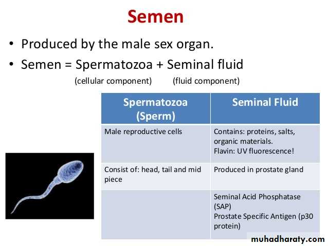 • يتكون المصل المنوي بصورة اساسية من حمض الستريك, والفركتوز, الاينوزيتول, والسوربيتول, والخمائر من فصيلة البروتييز والفوسفتيز والكولوفوسفوريل كولين. يفرز حامض السترك من غدة البروستات والفركتوز من الحويصلات المنوية.