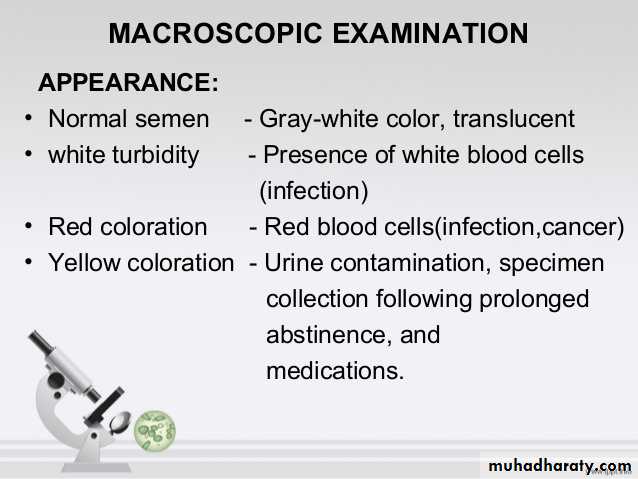 • الصفات العامة للمني: المني هو سائل رجاج ذو ملمس لزج, نصف شفاف ويميل الى اللون الحليبي الباهت وتتناسب عتمته طرديا مع محتوياته من الحيامن. المني قاعدي التفاعل, ويتسيل ويصبح شفافا ومتجانسا بعد بضعة دقائق من قذفه.