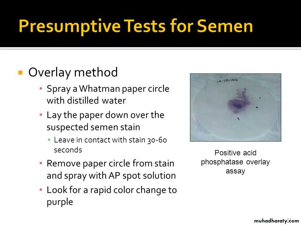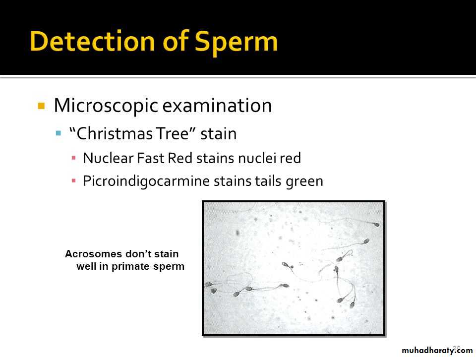 84والاختبارات المناعية تعتبر اكثر دقة في تشخيص المني وبنفس الوقت تشير الى انه بشري المنشأ. ان اكثر الفحوص وثوقا لتشخيص المني هو مشاهدة الحيامن المنوية البشرية تحت المجهريا بخصائصها المميزة.