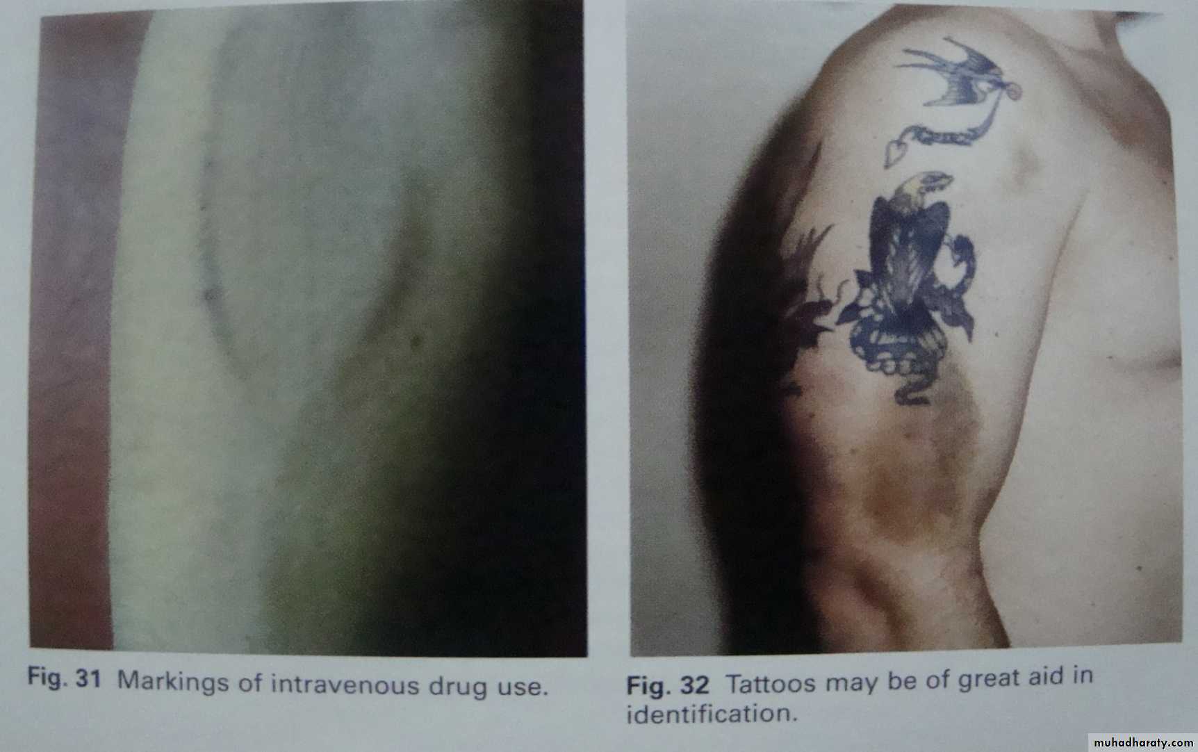 2) العلامات الفارقة او المميزة: وهذه اما ان تكون في ظاهر الجثة او باطنها, وقد تكون مكتسبة او وراثية. وتشمل العلامات الفارقة: التلونات الجلدية كالبرص والنمش والبهاق, والاكزما, والخال المنفرد او المتعدد, و الاورام الجلدية كالثأليل المختلفة. وكذلك تشمل التشوهات المفصلية والعظمية كما هو الحال عند الاقزام او الاشخاص الذين يملكون اصبعا اضافيا. ومن اهم العلامات الجلدية الفارقة : الوشم والوسم: والوشم هو عبارة عن غرز الابرة وذر النيلج عليه. ويستخدم الوشم لاغراض متعددة منها : ا) الاغراض تجميلية وفي هذه الحالة يتوضع الوشم عادة في زاوية العين الخارجية او في الذقن والمعصمين والرسغ او في الوجه الامامي للرقبة والجذع.