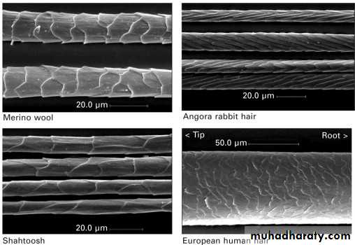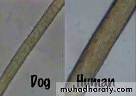 2) تعيين كون الشعرة بشرية او حيوانية: ويتم ذلك من خلال الفحص المجهري حيث تكون حراشف شعر الانسان قصيرة عريضة ومتعرجة الحواف مقارنة بشعر او وبر الحيوانات.