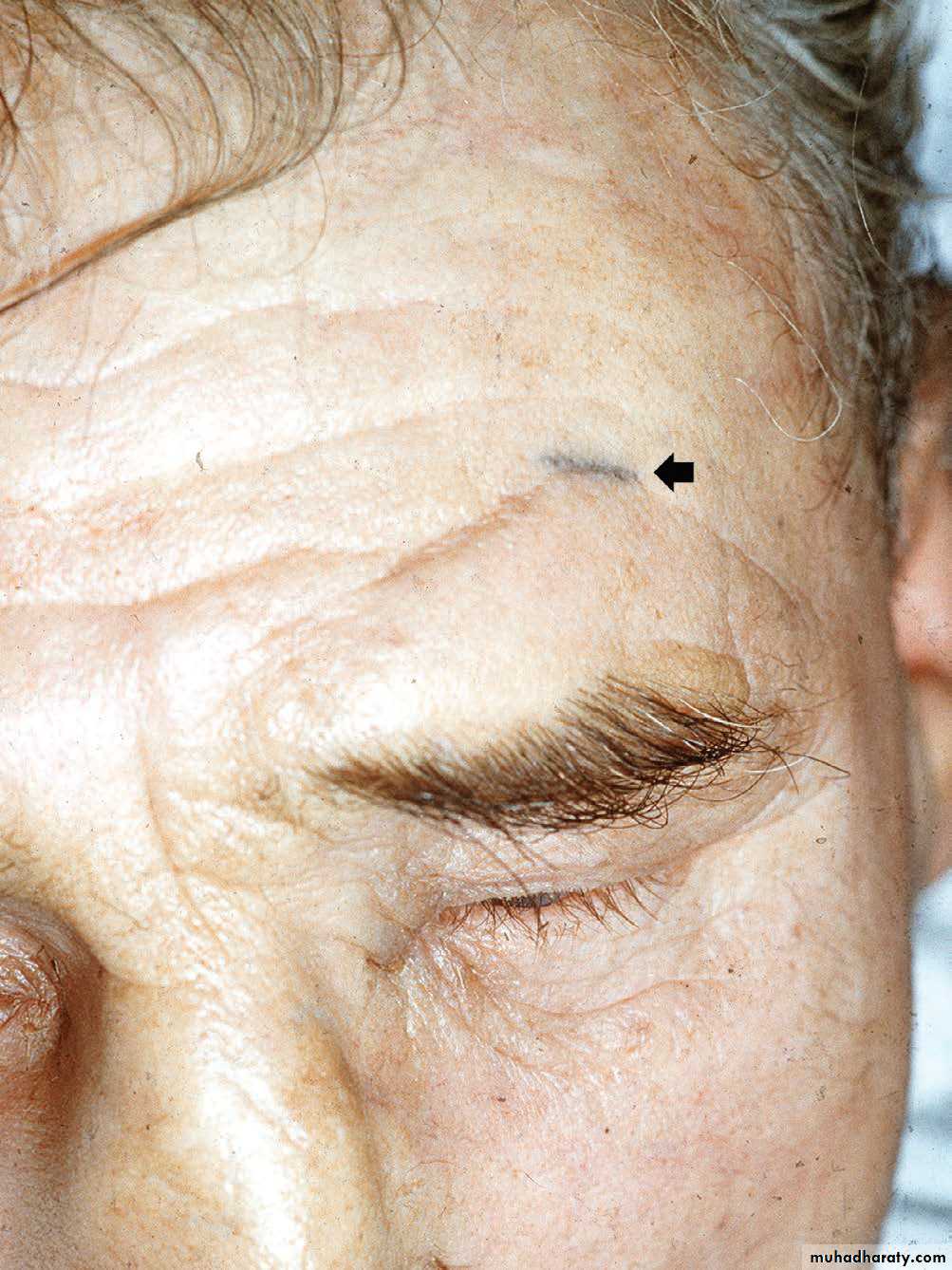 6• ب) اغراض علاجية: وفي هذة الحالات يتوضع الوشم في مناطق معروفة لدى ذوي المهن الطبية ويدل مكانه على عرض او مرض كان يشكو منه الشخص في تلك المنطقة, فعندما يتوضع الوشم في الصدغين فانه يدل على ان الشخص كان يشكو من صداع مزمن, وعندما يتوضع في المنطقة الشرسوفية فانه يدل على مغص معوي او مراري, وعندما يتوضع في الخاصرة فانه يدل على مغص كلوي.