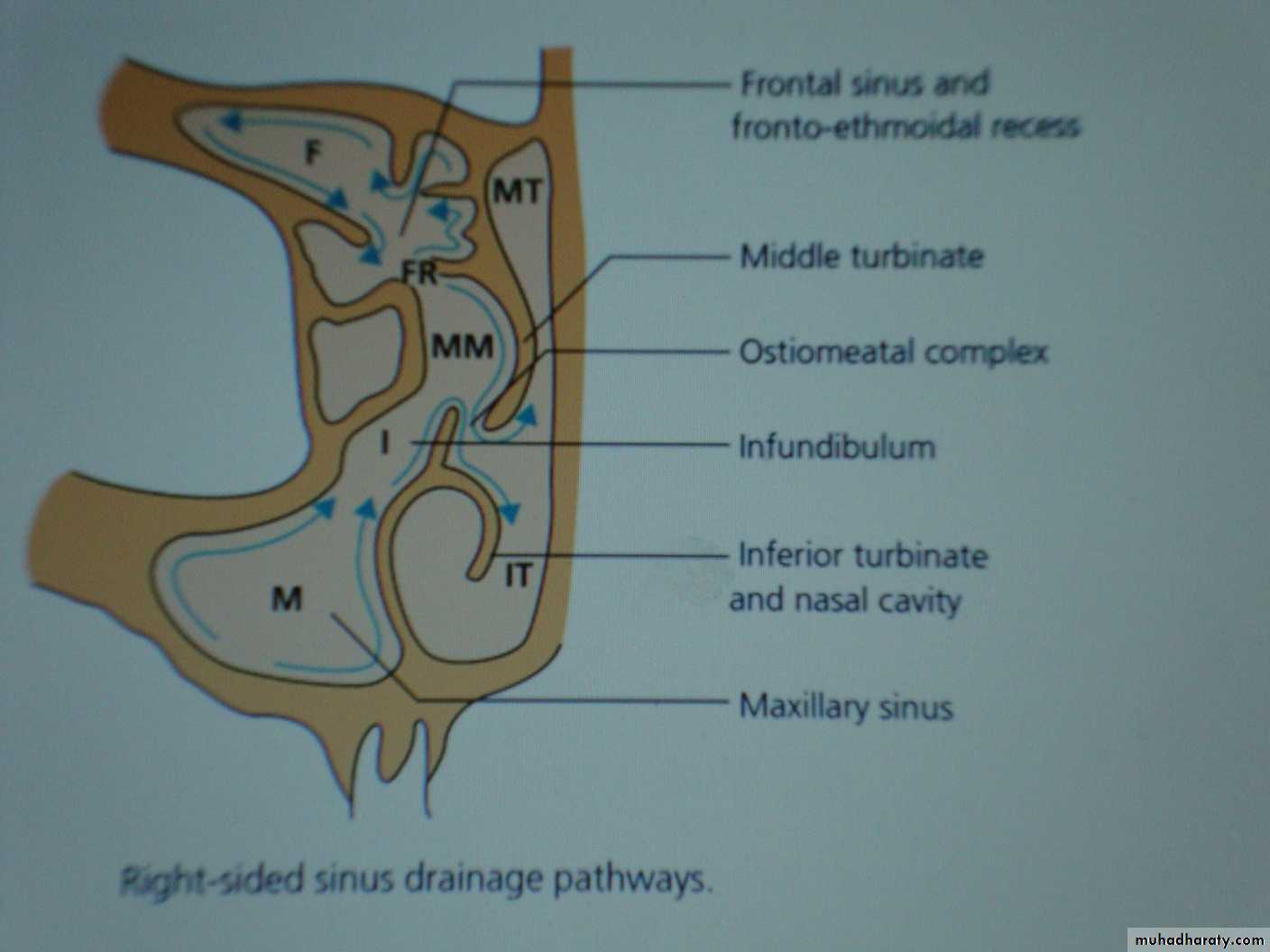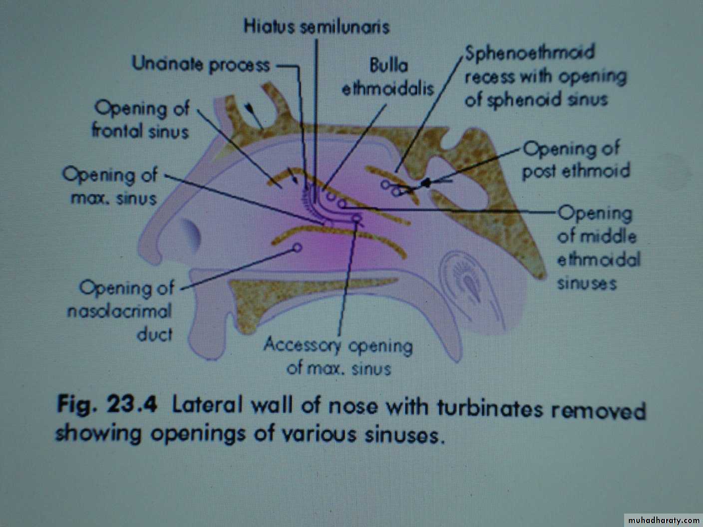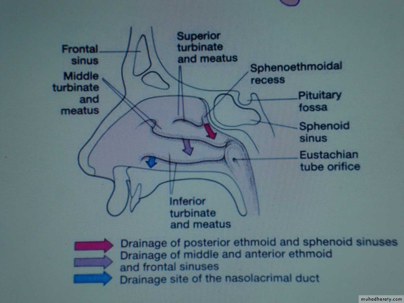 Middle meatus contains the ostia of maxillary, frontal & anterior ethmoidal sinuses.Inferior meatus receives the opening of the nasolacrimal duct.