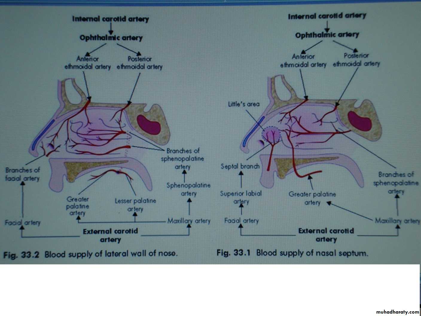 The blood supply of the nasal septum & lateral nasal wall: