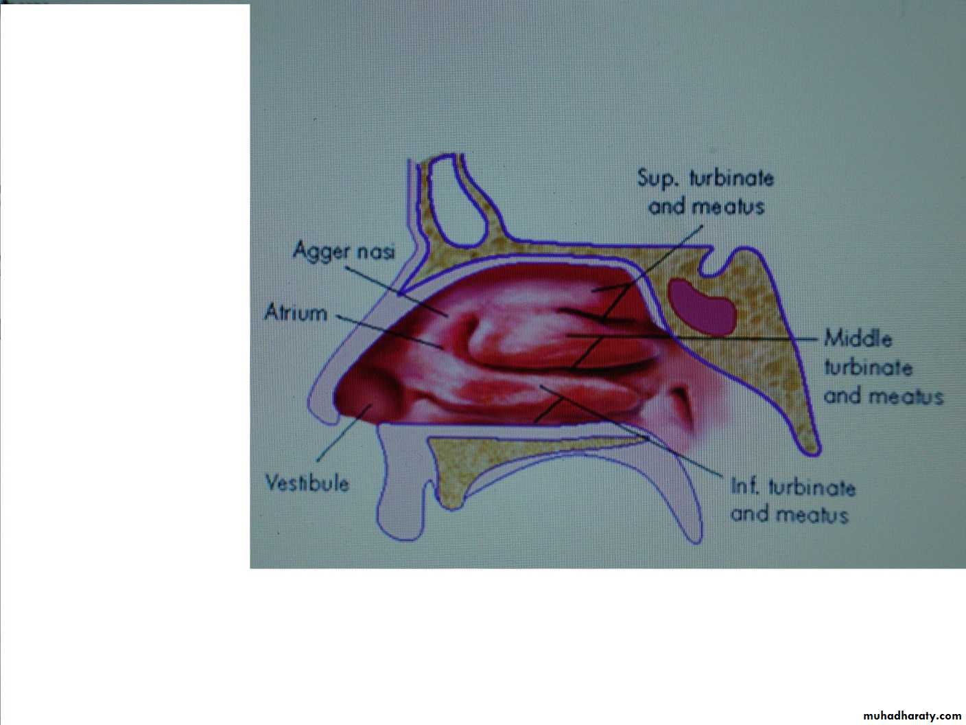 Three turbinates (superior, middle & inferior) the inferior turbinate is the largest.Three meati (superior, middle & inferior) each meatus lies below & lateral to the corresponding turbinate.