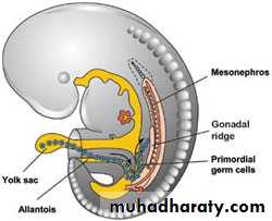 from the intermediate mesodermon each side of the root of the mesentery beneath the epithelium of coelom. The male and female reproductive systems follow a similar pattern of development, with sexual distinction coming about as a result of the influence of hormones.