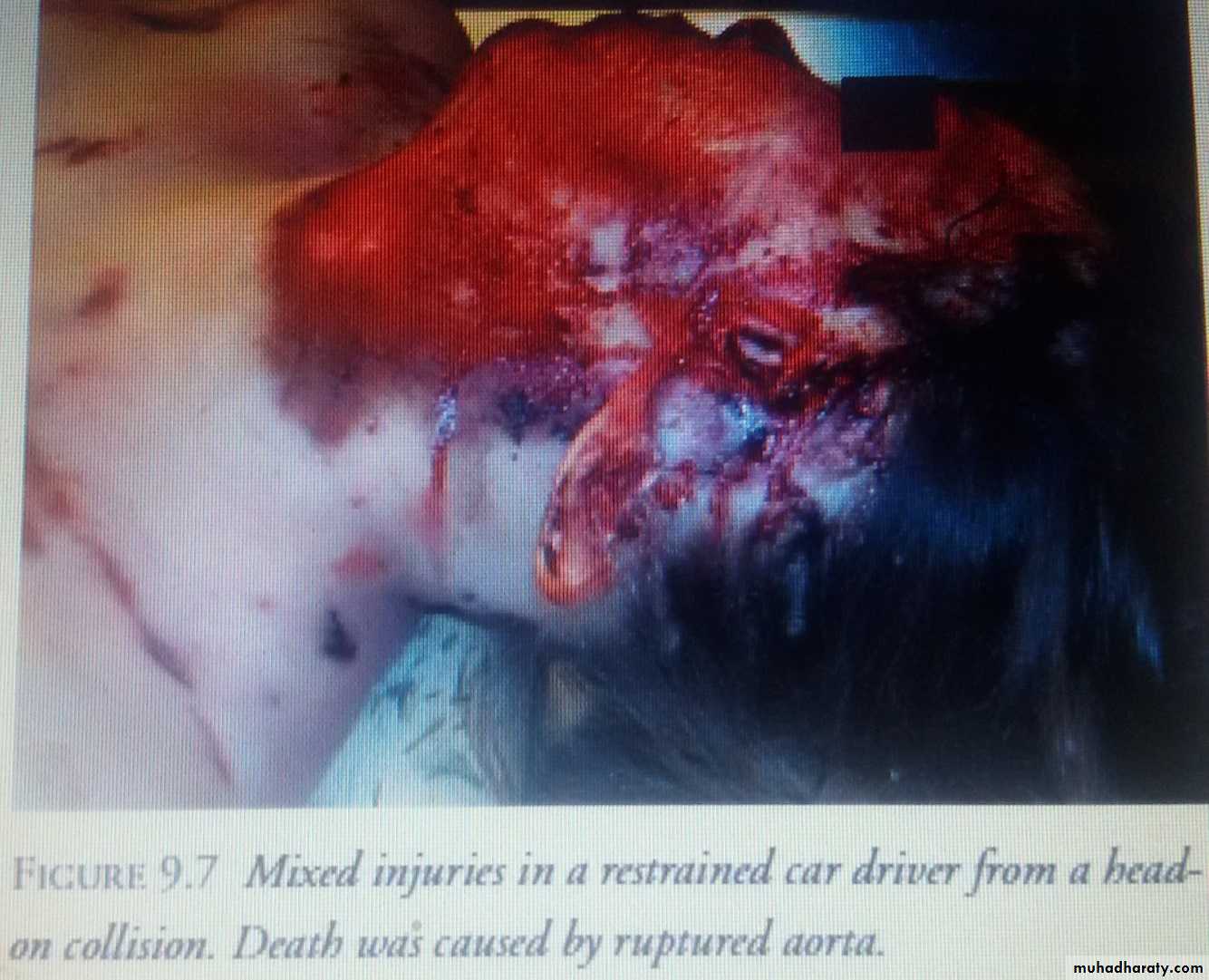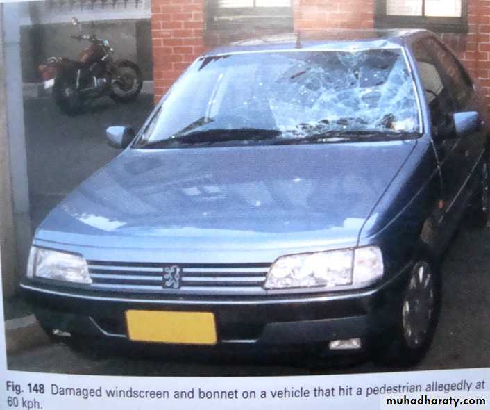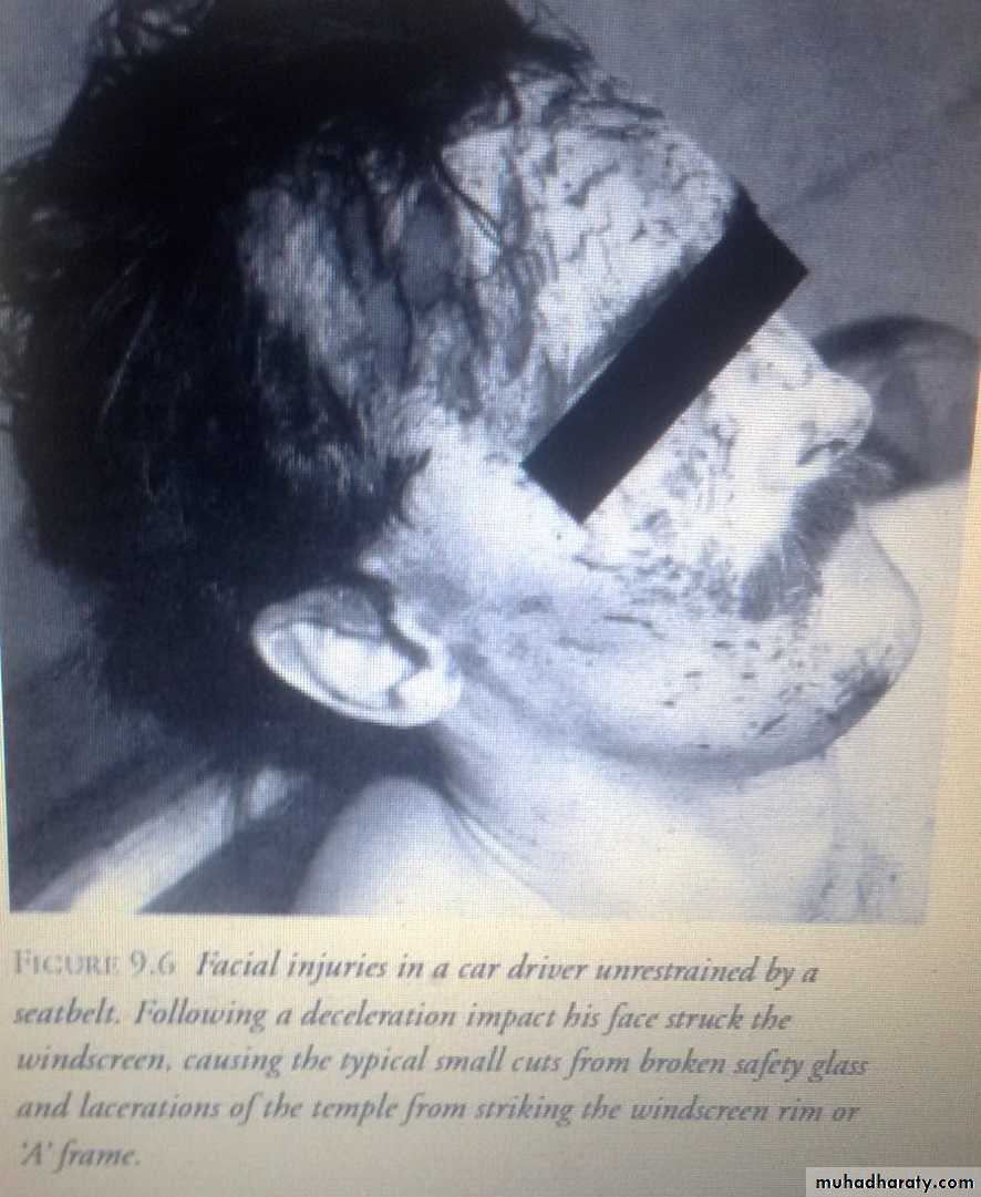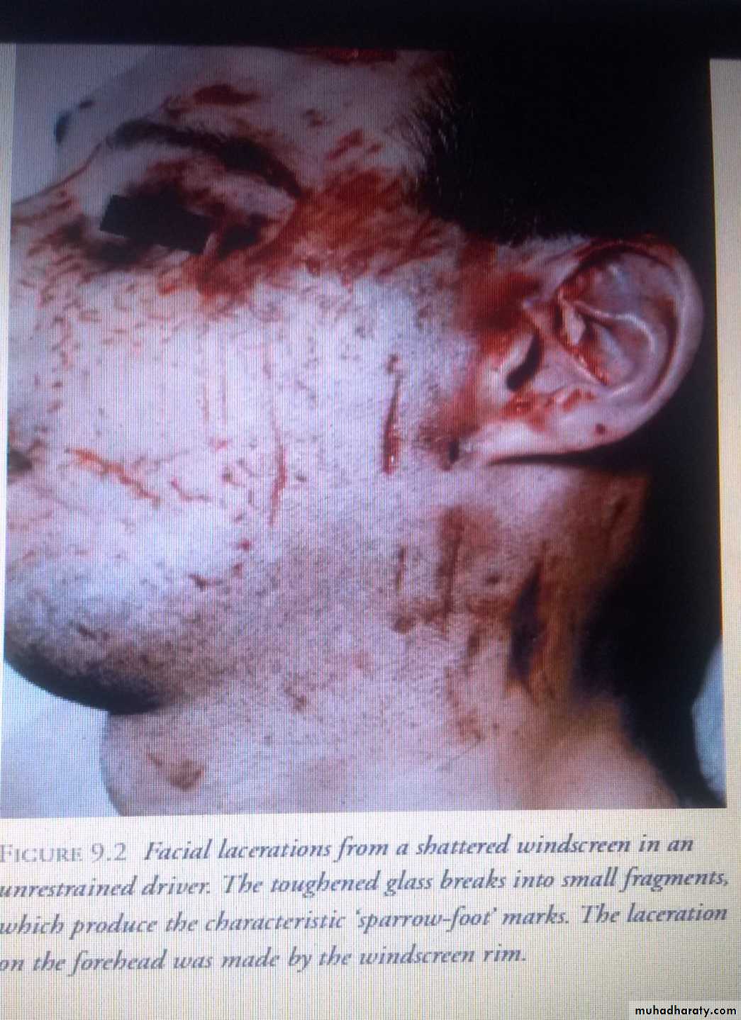 45ب ـ اضرار واقية الريح الامامية :ـ تصنع الواقية من زجاج ينكسر عند الصدم الى شضايا دقيقة ذات اشكال هندسية رباعية لاتتجاوز ابعادها 1 سم . لذا فعند الكسر في حوادث الاصطدام تصيب هذه الشضايا مقدم الوجه بسحجات ختمية متميزة تاخذ اشكال الشظايا الزجاجية. وعند عدم تكسر واقي الريح فيفضي الامر الى كسور في عظام الانف او القوسين الوجنين او العظم الجبهي . وفي الحالات الاشد تحصل اضرار سحائية دماغية مختلفة الدرجات اعتمادا على شدة الصدم .
